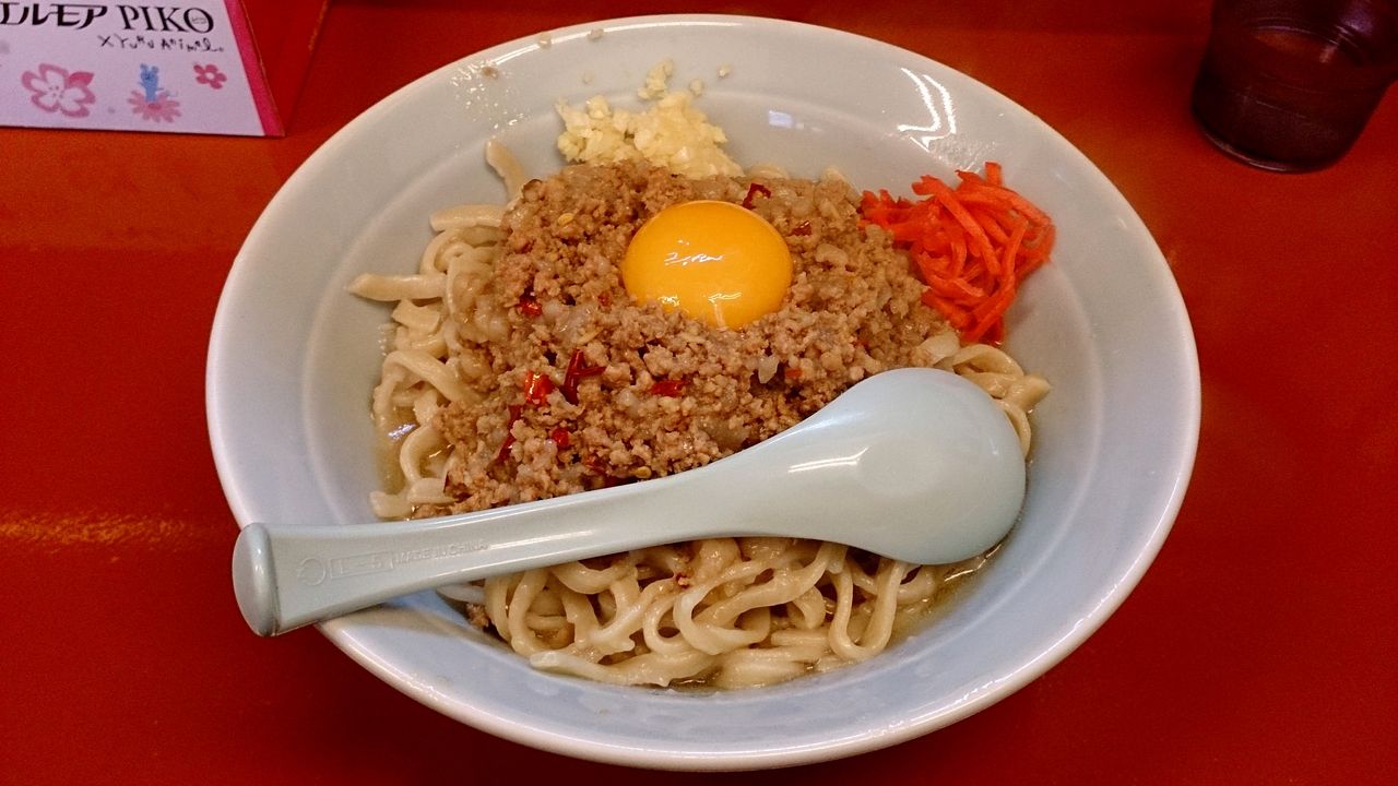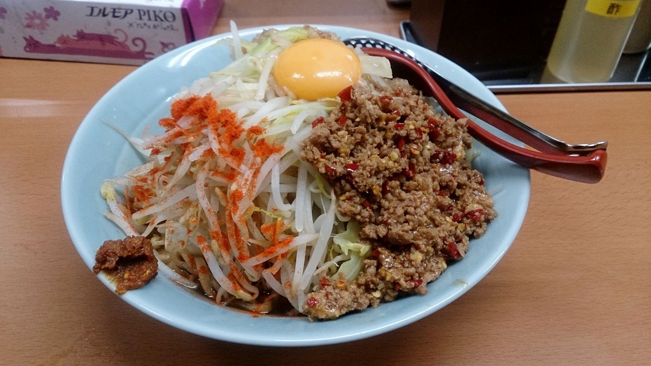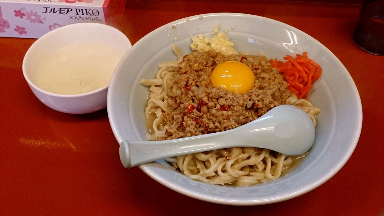 出て来たマシライス麺変更は、緩やかなWAVEと平たさのある麺の上に、肉味噌、卵黄、紅しょうが、刻みニンニクがトッピングされており、レンゲがあったので先にタレを飲んで(?)みると、甘塩っぱい感じのもので、ジャンキーな感じながらもクセになりそう♪